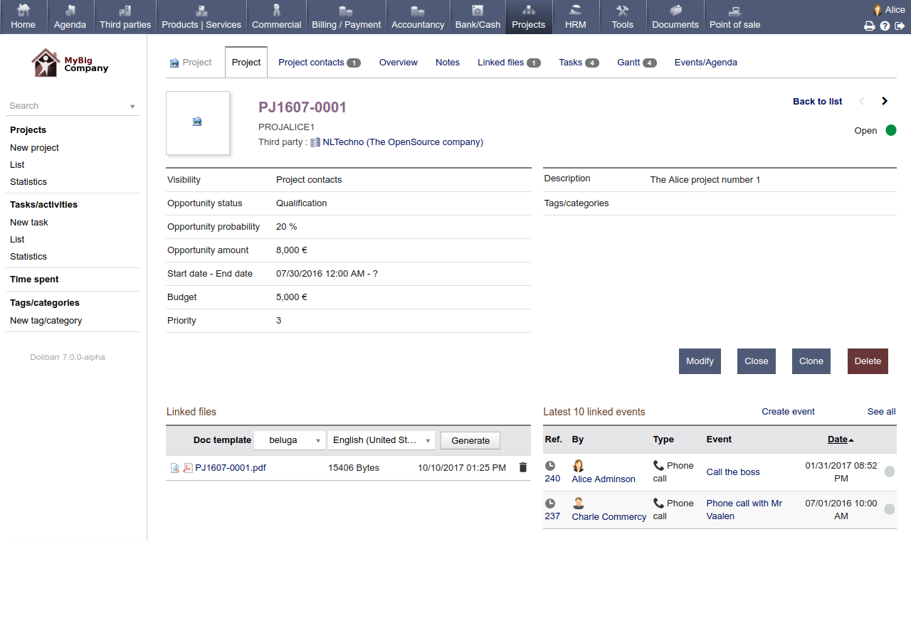 Avec le CRM de Dolibarr, vous pouvez également activer des fonctionnalités qui incluent des opportunités, un service d’assistance et des commandes. Celles-ci garantissent que votre équipe de vente travaille efficacement et qu'elle dispose de toutes les informations nécessaires pour réussir à vendre vos produits.